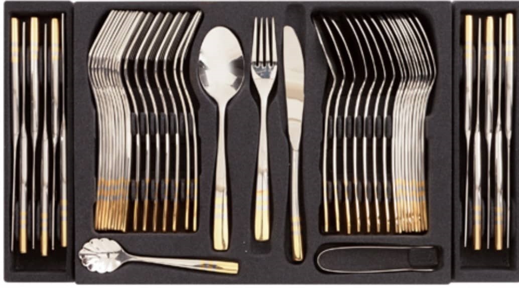 قاشق 24 – چنگال 24 – کارد میوه 12 – چنگال میوه 12 – مربا 6 – چای 6 – شربت 6 – کفگیر 3 – ملاقه بزرگ 2 – سرو خورش 3 – جعبه کادویی |